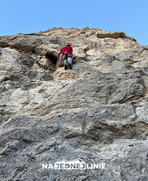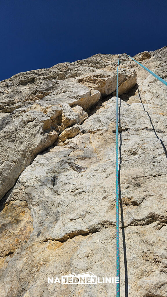 Crux to pokonanie okapu na ostatnich metrach – wygląda groźnie, ale w praktyce jest łatwiejszy, niż to wygląda stojąc przy jednej wpince poniżej okapu.