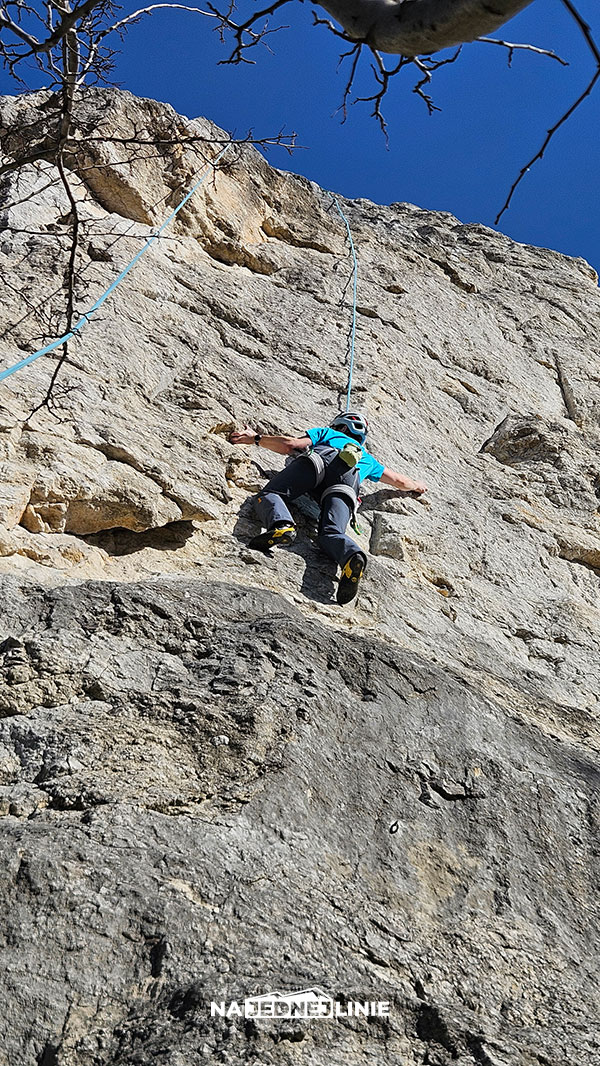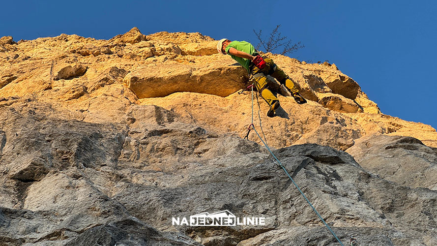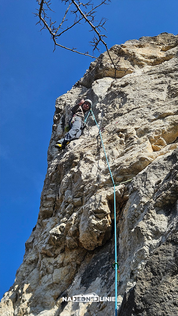 A tak serio – droga ma świetne obicie. Wpinka w cruxie jest praktycznie przy biodrze, więc naprawdę nie było się czego bać. Pod samym okapem dobrze się stoi, można spokojnie zrobić wpinkę i cofnąć się pod okap na rest.