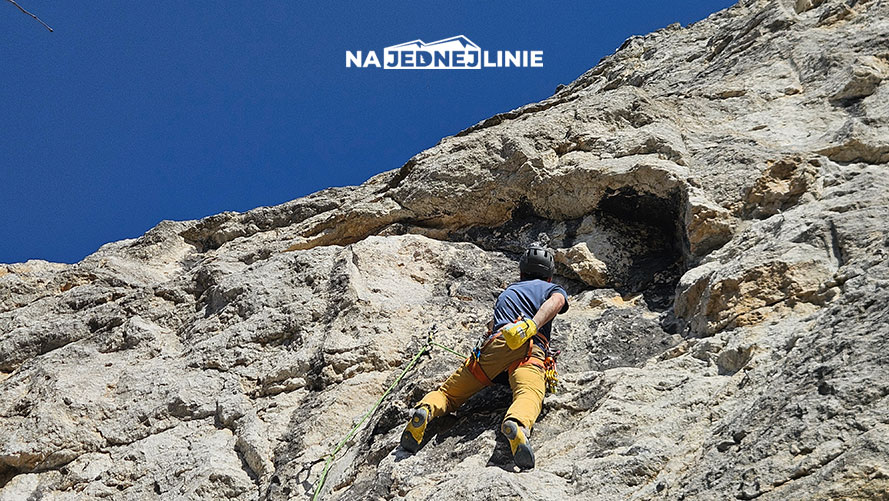 To propozycja dla tych, którzy dobrze czują się na powietrznych drogach. Crux stanowi długość dwóch wpinek w środkowej części drogi. Zaczyna się krótkim trawersem w lewo – dosłownie dwa kroki, ale bardzo czujne – a następnie idziemy do góry. Dobrze rozstawiając nogi, przechodzimy przez wybrzuszenie. Do dyspozycji mamy kilka dobrych chwytów.