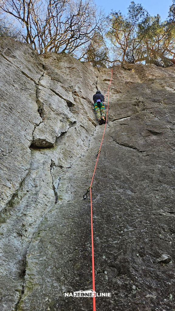 Sama linia również jest piękna. To typowa, skradająca się wspinaczka po płycie – z dwoma bardziej ciągowymi odcinkami na krawądkach, pomiędzy którymi są miejsca na resty i kierunkowe klamy pomagające złapać oddech (czasem nawet z małą półeczką). Udało się OS, co zdecydowanie zrobiło mój dzień.