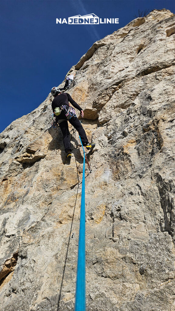 Crux to pokonanie okapu – wygląda groźnie, ale w praktyce jest łatwiejszy, niż przy jednej wpince poniżej okapu.