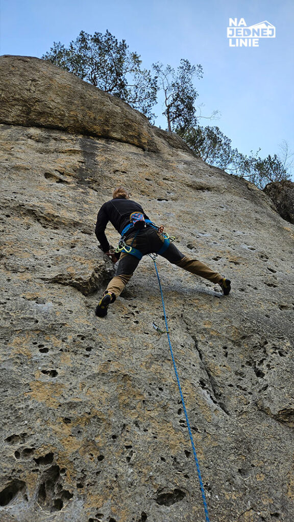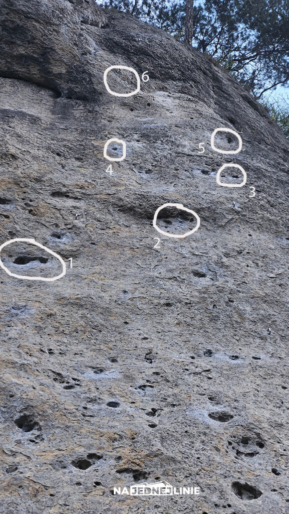 Pierwsze trzy wpinki polegają na dojściu do odpęknięcia po lewej stronie – po dobrych chwytach. Będąc wyżej zaczynamy na nim stawać lewą nogą, mając prawą nogę szeroko. To moment, w którym można jeszcze dychnąć – ostatnia okazja przed trudniejszą sekwencją.