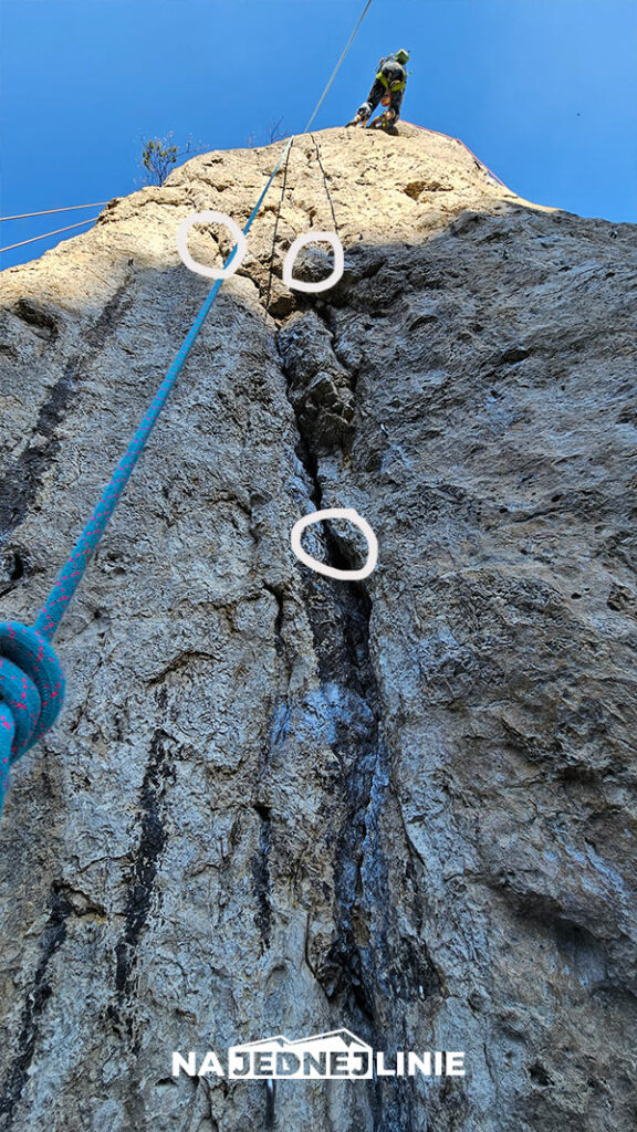I ta wpinka na wyjściu z cruxa, wydawała się absurdalnie oddalona, wklejona gdzieś wysoko w górnej części ściany. Jak bedzie lot to do połowy drogi. W tamtym momencie byłem przekonany, że gdyby ktoś ją wycenił na VI.3 (7a), to nikt by sie nie pogniewał.