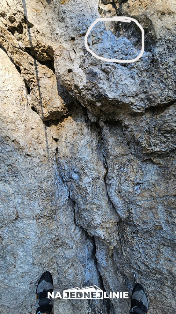 Prawa ręka pracuje w rysce i, co ciekawe, daje całkiem solidne poczucie kontroli – szczególnie jeśli trafisz w tę właściwą, głębszą z dwóch równoległych pionowych rysek po prawej stronie. To ona trzyma cię w ścianie i pozwala w ogóle myśleć o dalszym ruchu, ale sama w sobie nie rozwiązuje problemu. Całe napięcie kumuluje się w tym jednym momencie, kiedy musisz zdecydować się zaufać tarciu (na lewą nogę).