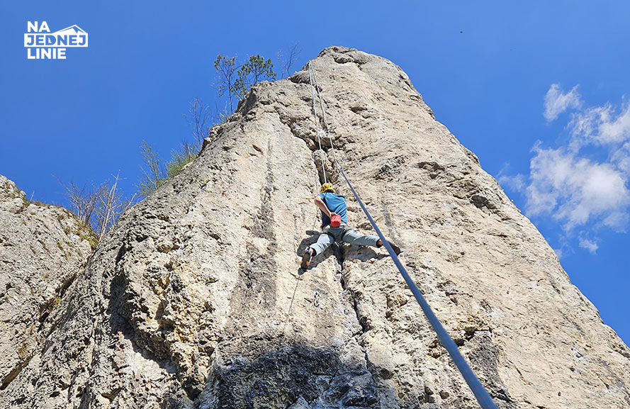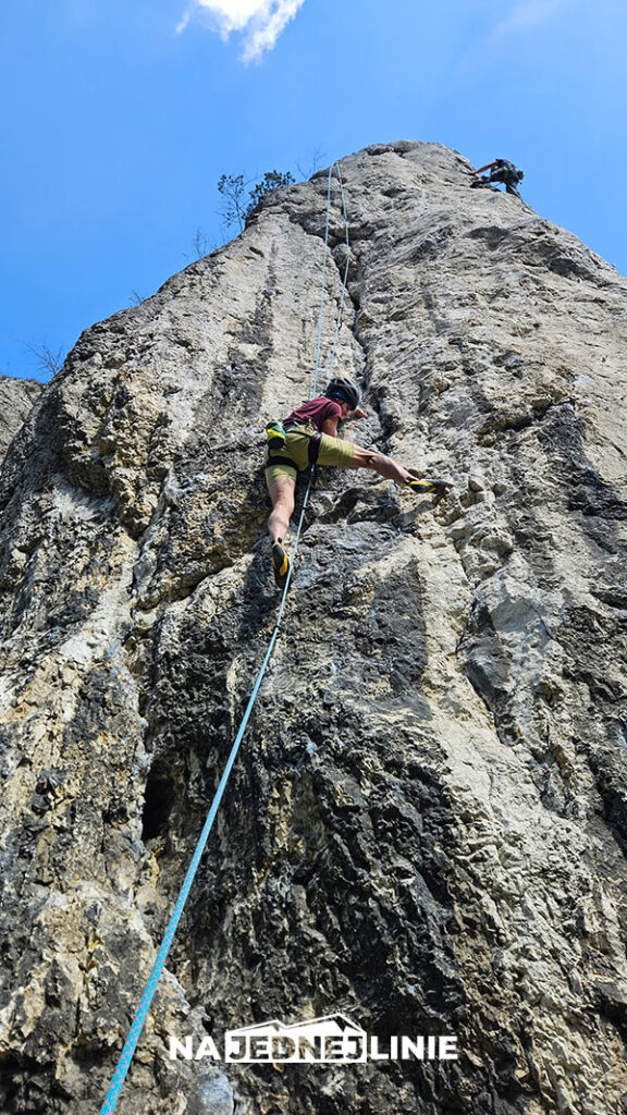 Przed tobą wyrasta płyta z solidnymi rysami po obu stronach. Wygląda niegroźnie, ale kiedy zaczynasz ją czytać, szybko okazuje się, że klucz tkwi nie w rękach, tylko w tym, czego… brakuje pod nogami. Cała trudność sprowadza się do sięgnięcia lewą ręką do krawędzi tej płyty (w rysie), ale problem polega na tym, że lewa noga nie ma gdzie stanąć. Ściana jest gładka, i nie oferuje żadnego oczywistego stopnia, który dałby ci stabilność do tego ruchu.