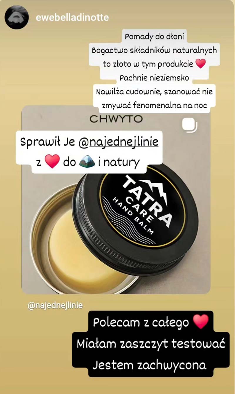 Tatra Care to naturalna pomada stworzona z myślą o dłoniach, które pracują na szlakach, w wietrze, chłodzie i ostrym słońcu. Odżywia, koi i chroni skórę po długich dniach w górach, zapewniając regenerację, której potrzebują ci, którzy wybierają wysokość zamiast wygody.