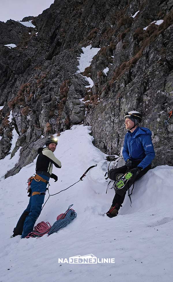 Ja i Bartek uprząż oraz raki ubraliśmy od razu po wyjściu ze schroniska. Teraz czas na Szymona, żeby nadrobił zaległości.