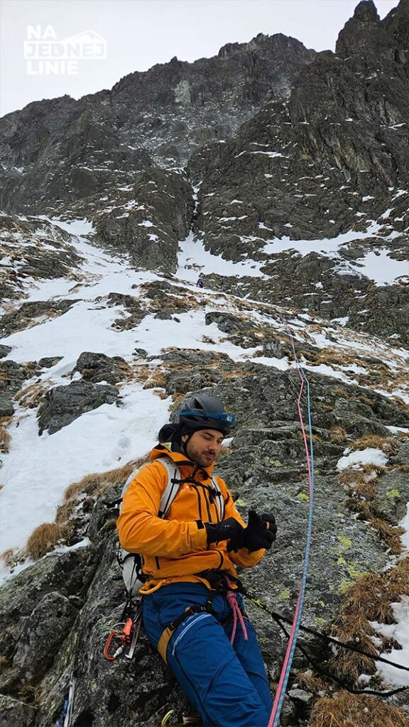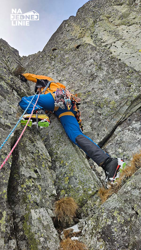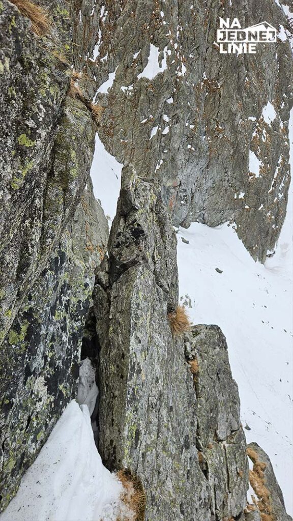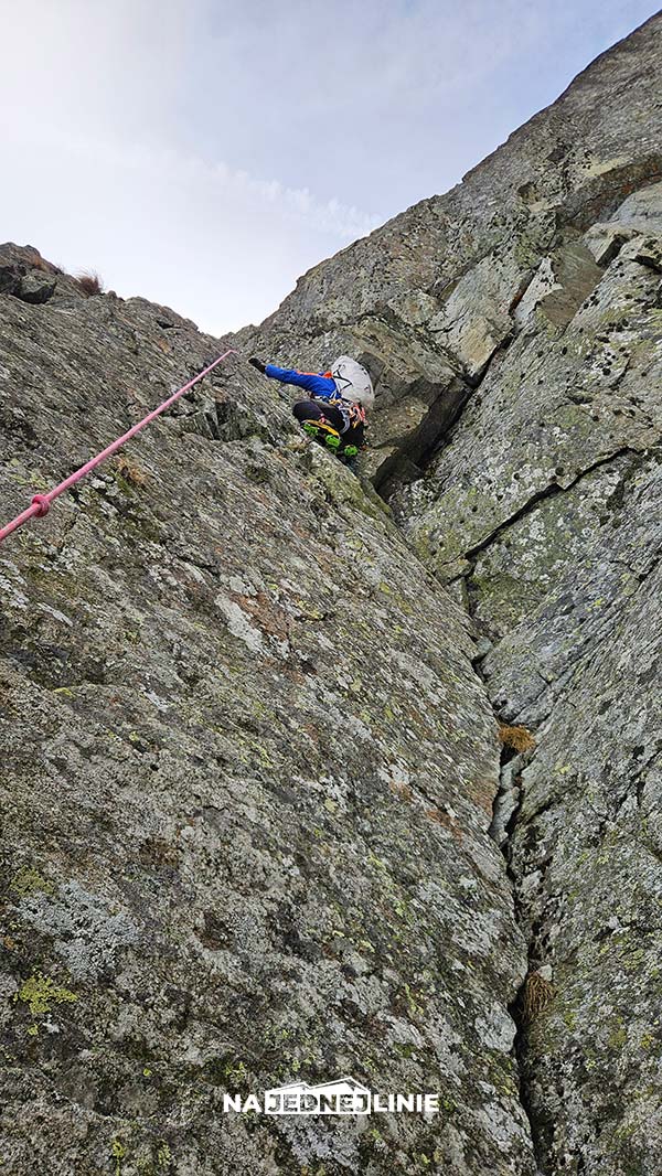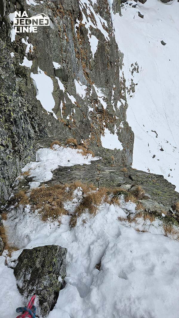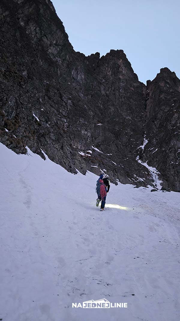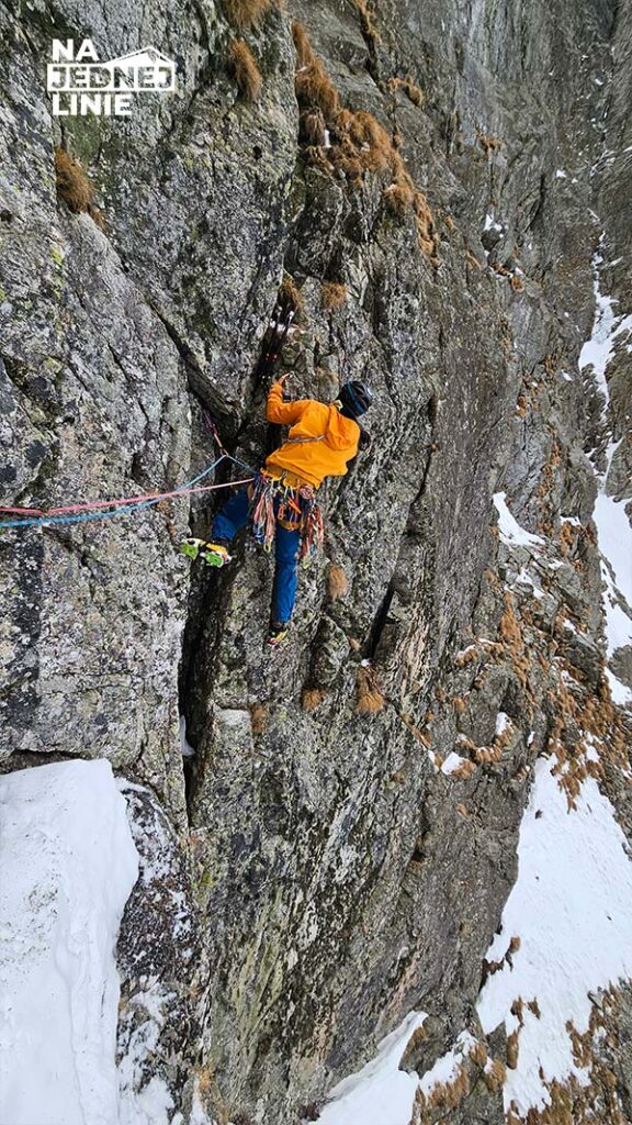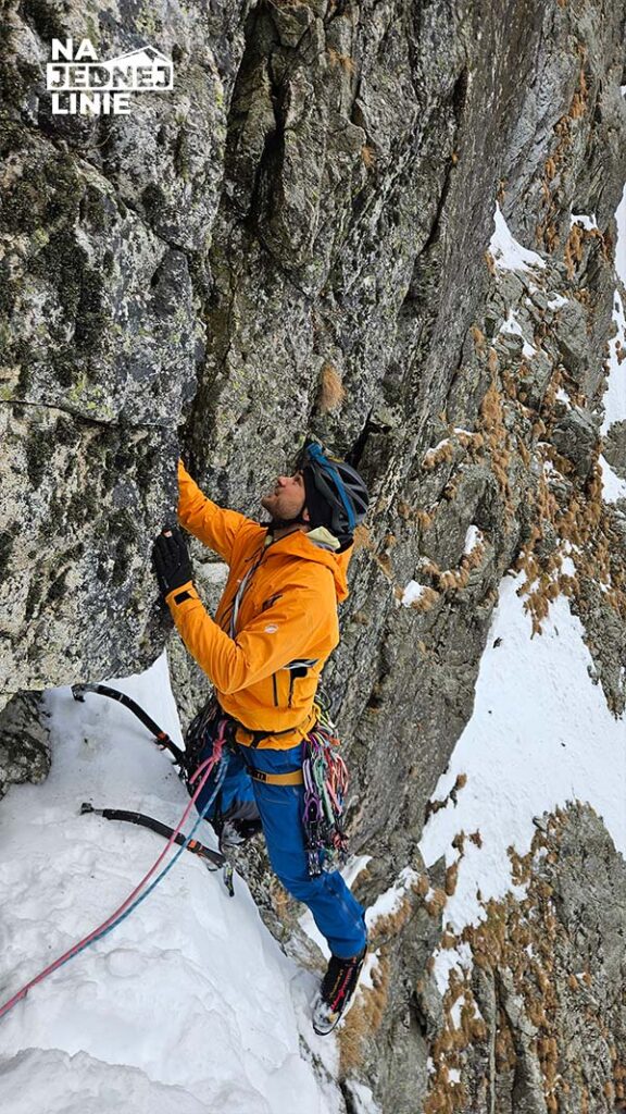 Zaczynamy wejściem w komin. Śniegu jest niewiele, dlatego łatwiej przechodzimy ten fragment „na łapach”. Samo wejście do komina z naszej półki jest dość czujne — trzeba się najpierw obniżyć, utrzymując równowagę blisko płyty, którą trzymamy z dołu na odciąg. W ten sposób można jedną nogę odstawić do komina, a następnie przenieść cały ciężar ciała do środka.