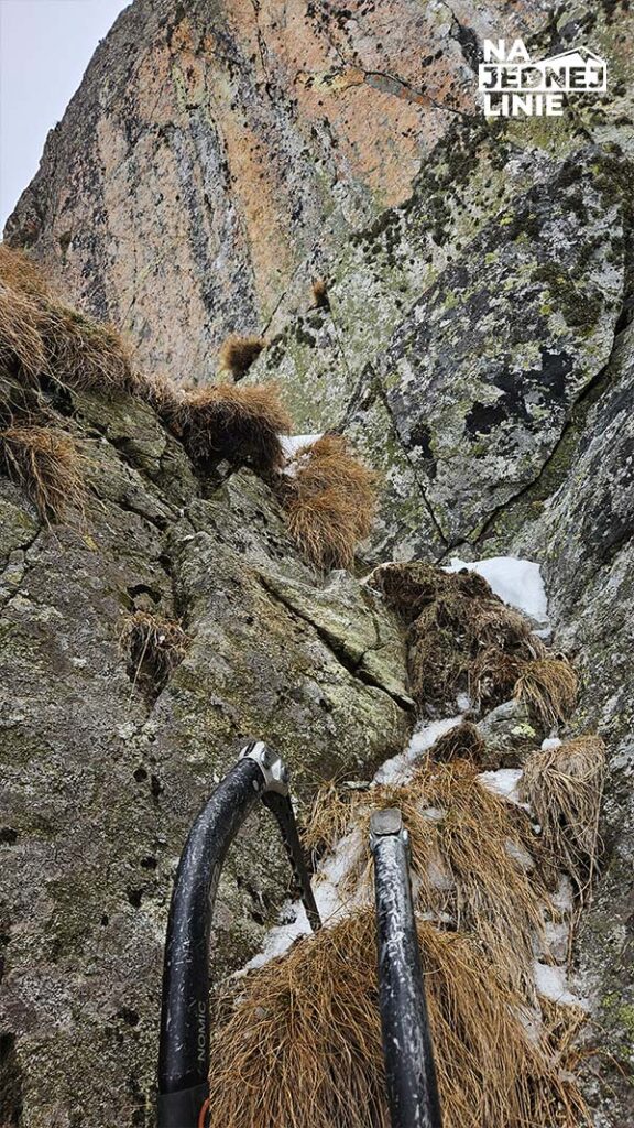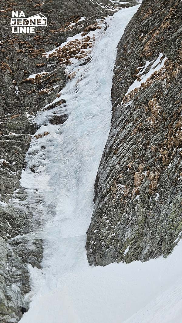 Trawersujemy kilkanaście metrów w lewo w stronę trawiasto-kamienistej ścianki. Dosłownie obok wykształcił się jednak lodospad, który wyglądał bardzo solidnie — niestety nie mieliśmy śrub lodowych. Na pierwszy rzut oka wyjście lodospadem na pole śnieżne wyglądało bezpieczniejsze niż wspinanie się po tej kamienistej ściance.