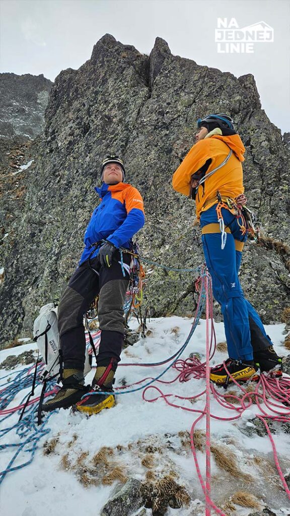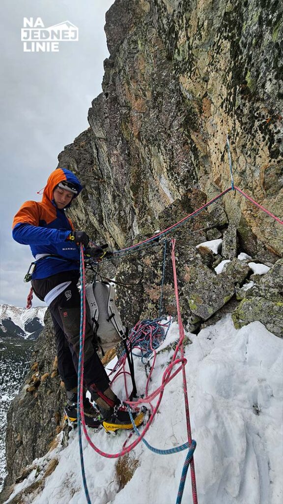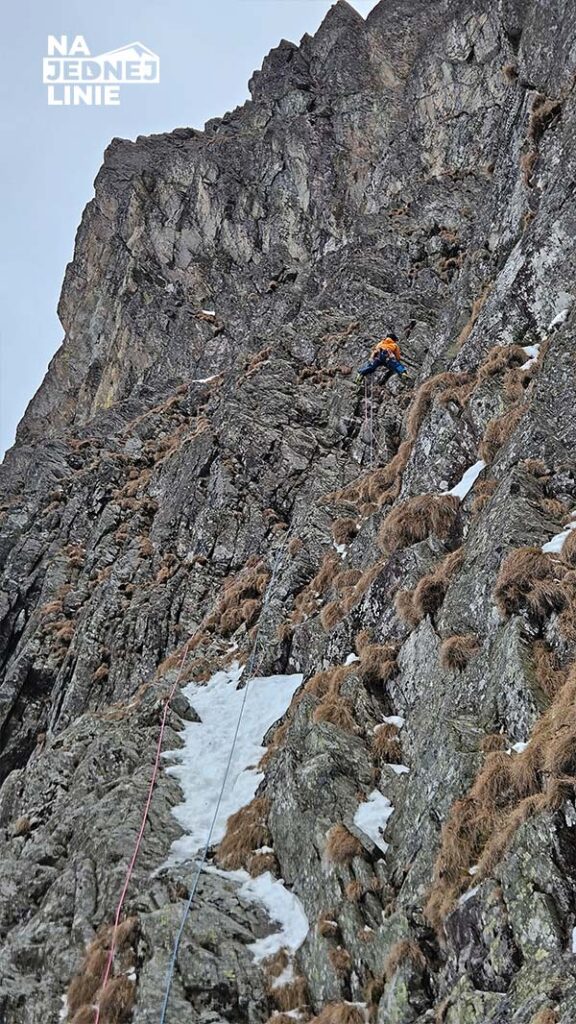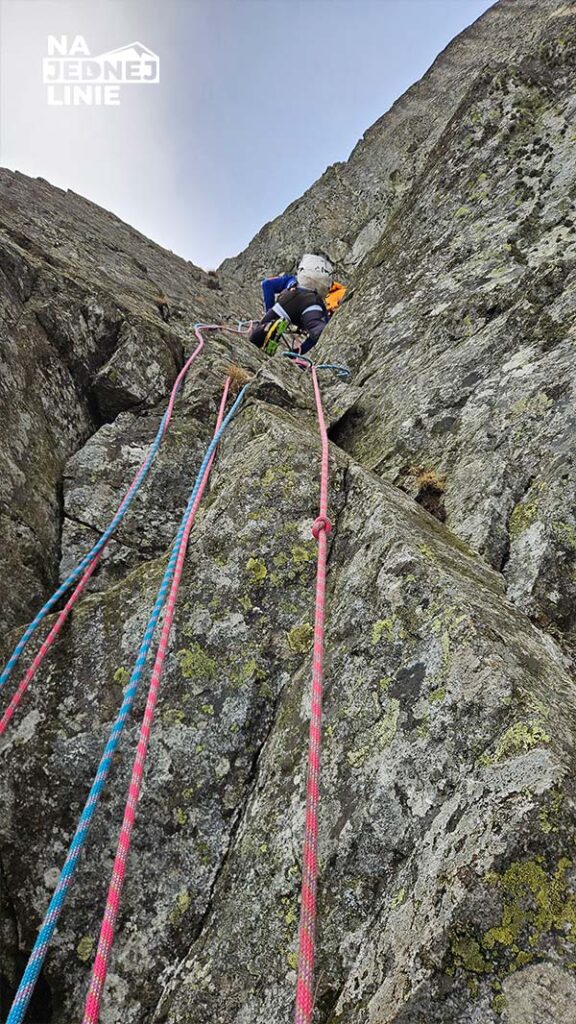 Specjalnie na ten fragment zabraliśmy dwa buldogi, które teoretycznie mogłyby się też przydać na pierwszym wyciągu. Asekuracja jest trudna, mimo że teren jest łatwiejszy — trzeba bardzo uważać, żeby niczego nie zrzucić.